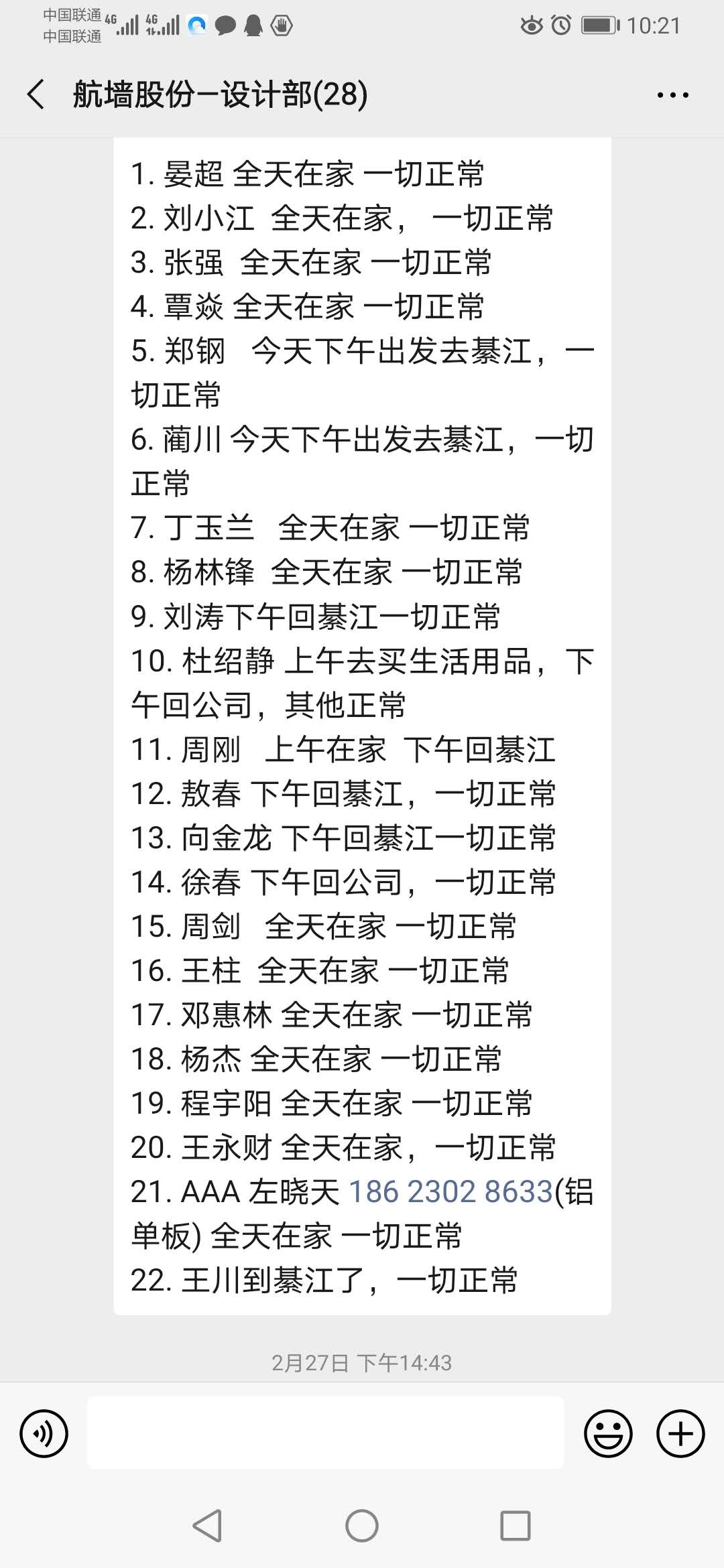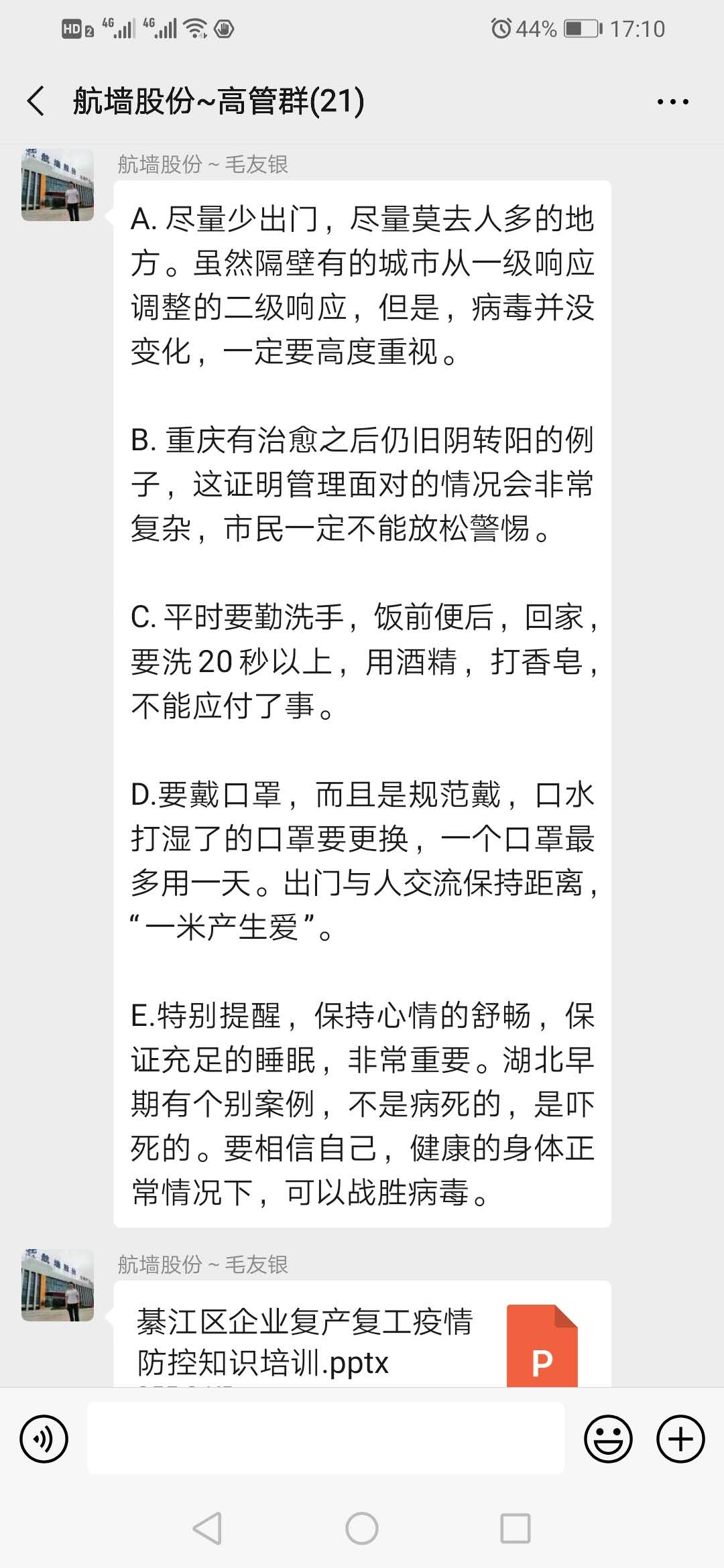 公司提前在各微信群里,發送防疫手冊內容和各種防疫知識,讓全體員工充分了解疫情的危害和怎樣預防新冠病毒,要求全體員工從216日開始在微信群里每天報告出行軌跡和身體狀況。